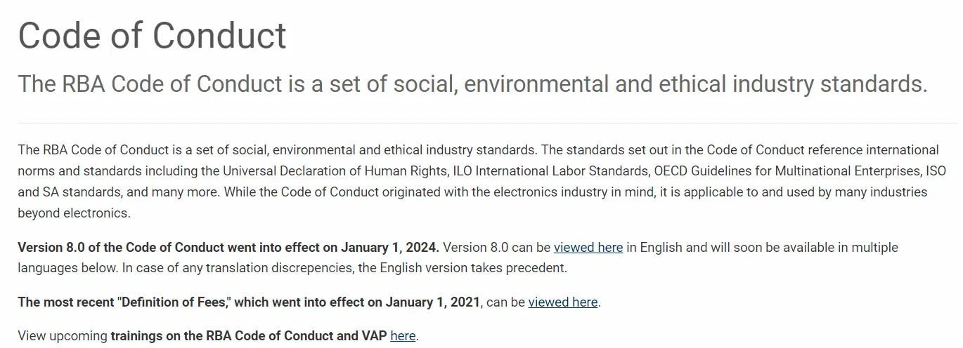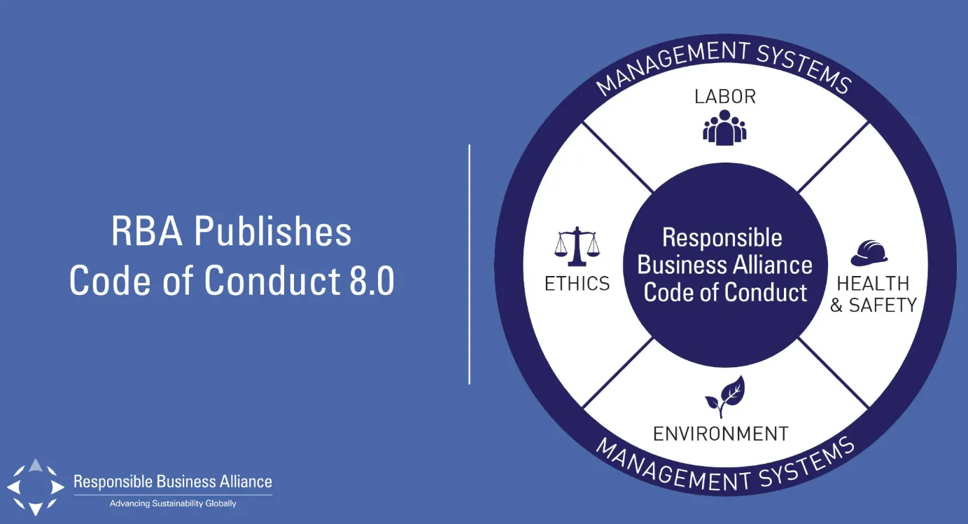 RBA 행동 규범은 참가기업들 및 그리고 그들의 공급망이 안전한 작업환경을 구축하고, 근로자에 대한 존중과 존엄성을 보장하며, 환경친화적이고 윤리적인 기업 운영을 하도록 제정한 기준입니다.