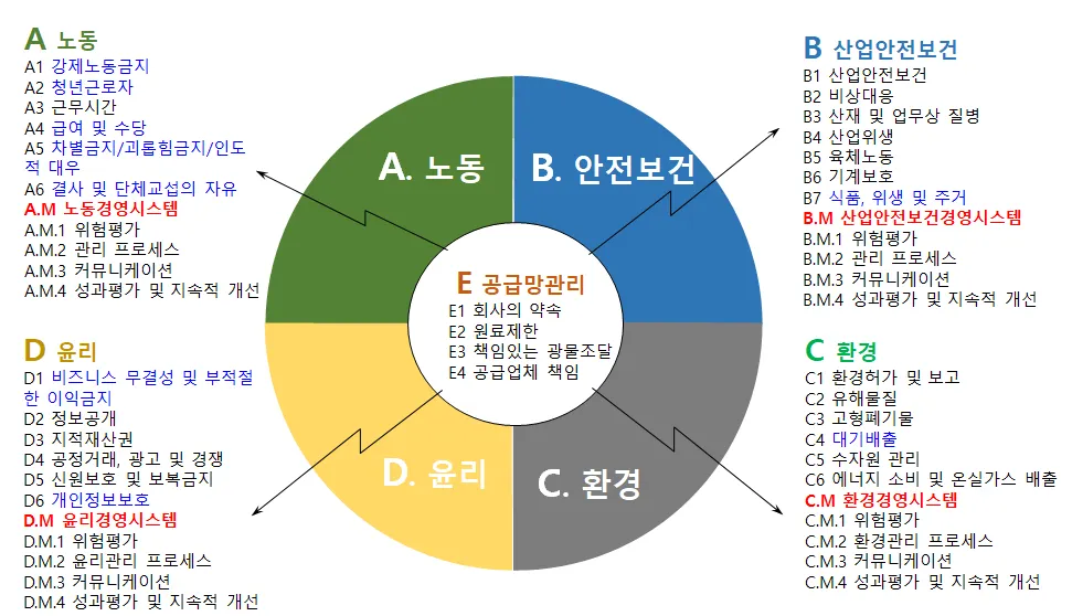 RBA CoC의 요구조항은 다음을 포함하여 국제적으로 인정된 표준에서 파생되었으며 해당 부문별로 관련사항들이 반영되어 있습니다.