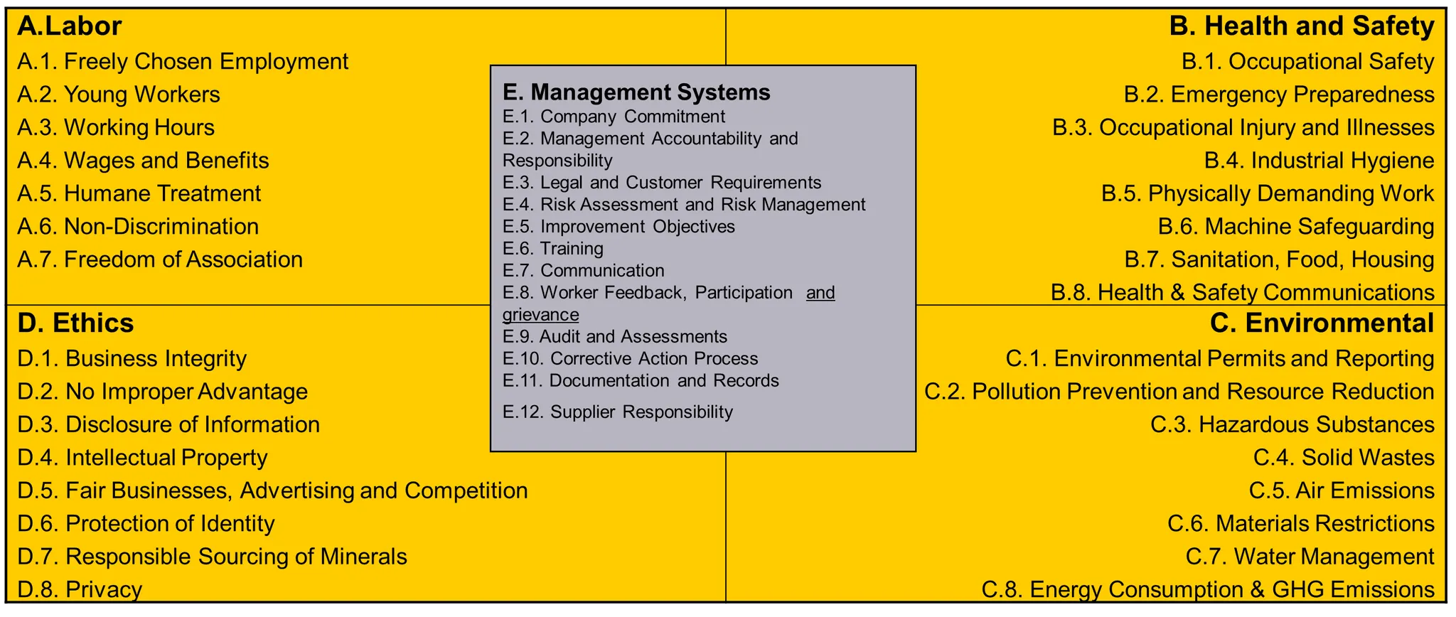 Responsible Business Alliance(RBA) 행동규범은 기업의 공급망 전반에 대한 사회적 책임(Corporate Social Responsibility)을 강화하고자 하는 RBA 회원사들을 위한 가이드라인입니다. RBA 행동규범에는 아동노동 및 강제노동 금지, 근로시간 준수, 공정한 보수 지급, 안전하고 건강한 근로환경 조성, 환경보호 활동 등을 포함하고 있으며, RBA 회원사들과 그들의 공급업체는 이 행동규범을 준수하여야 합니다. 준수 여부는 RBA의 진단 및 평가 프로그램을 통해 정기적으로 점검되며, RBA 행동규범 준수는 전자, 소매, 자동차 산업 등에서 중요한 경쟁우위를 제공하고 기업의 지속가능성을 높이기 위한 핵심 요소입니다.