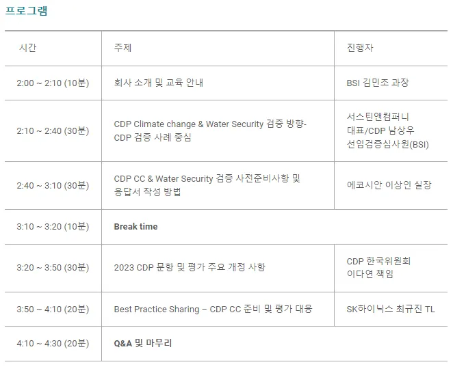 23년 5월 24일 수요일 2시에 ‘CDP 기업보고서 검증 및 최신동향 안내’ 오프라인 세미나가 아미드 호텔 아미드 홀에서 개최되었습니다. 서스틴앤컴퍼니 대표(BSI선임검증심사원) 남상우, 에코시안 이상인 실장, CDP 한국위원회 이다연 책임, SK 하이닉스 최규진 TL 께서 발표를 진행해주셨습니다.